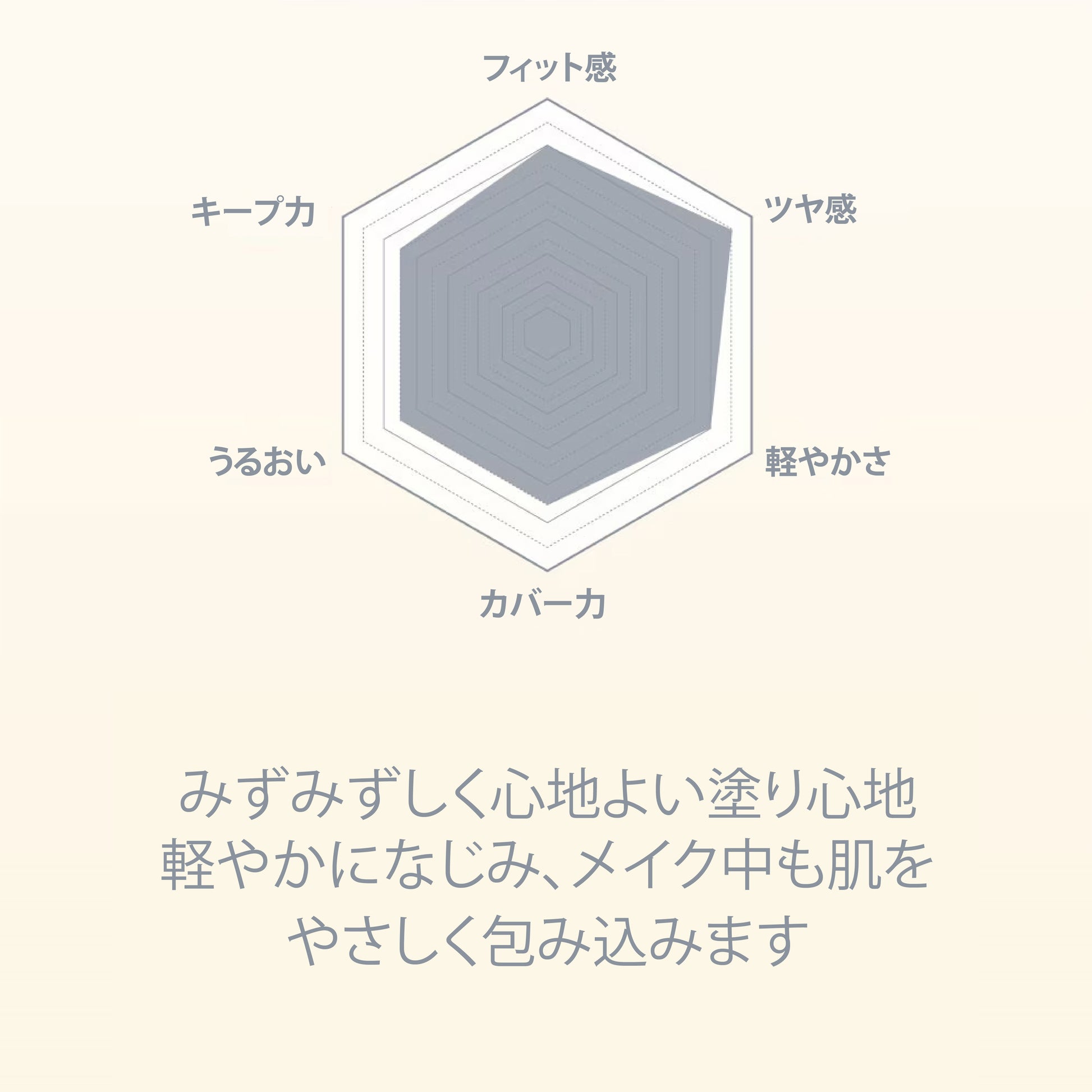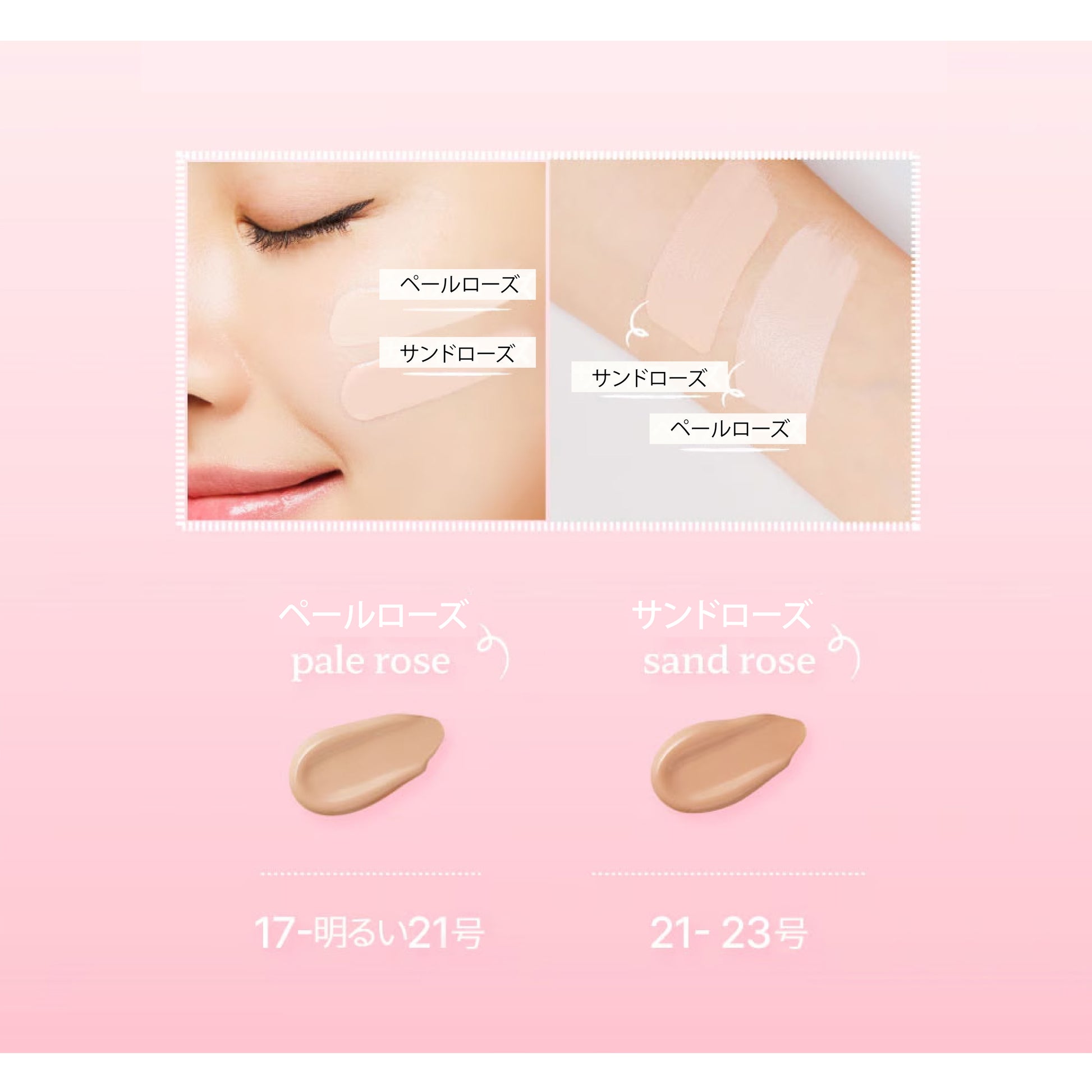 2重のフィルムレイヤーが肌をなめらかに包み込み、メイクの密着感と美しい仕上がりをキープ※2します。気になるくすみをカバーし※2、パッと明るく※2いきいきとした肌印象へと導きます。※ペールローズは17番~明るめの21番カラーに相当します。