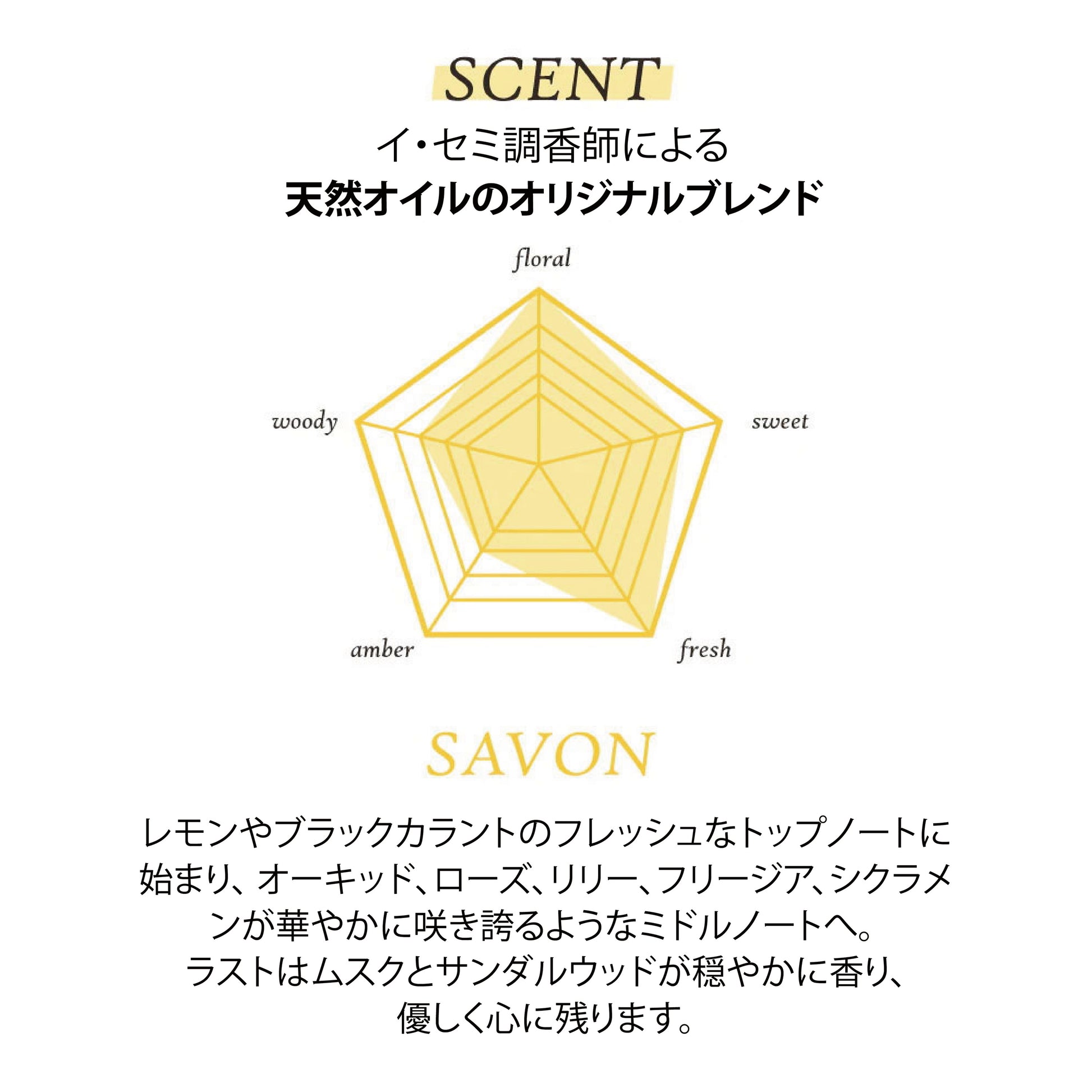 専属調香師による、エッセンシャルオイルを使用したオリジナルブレンド、サボンの香りがほのかに持続します。