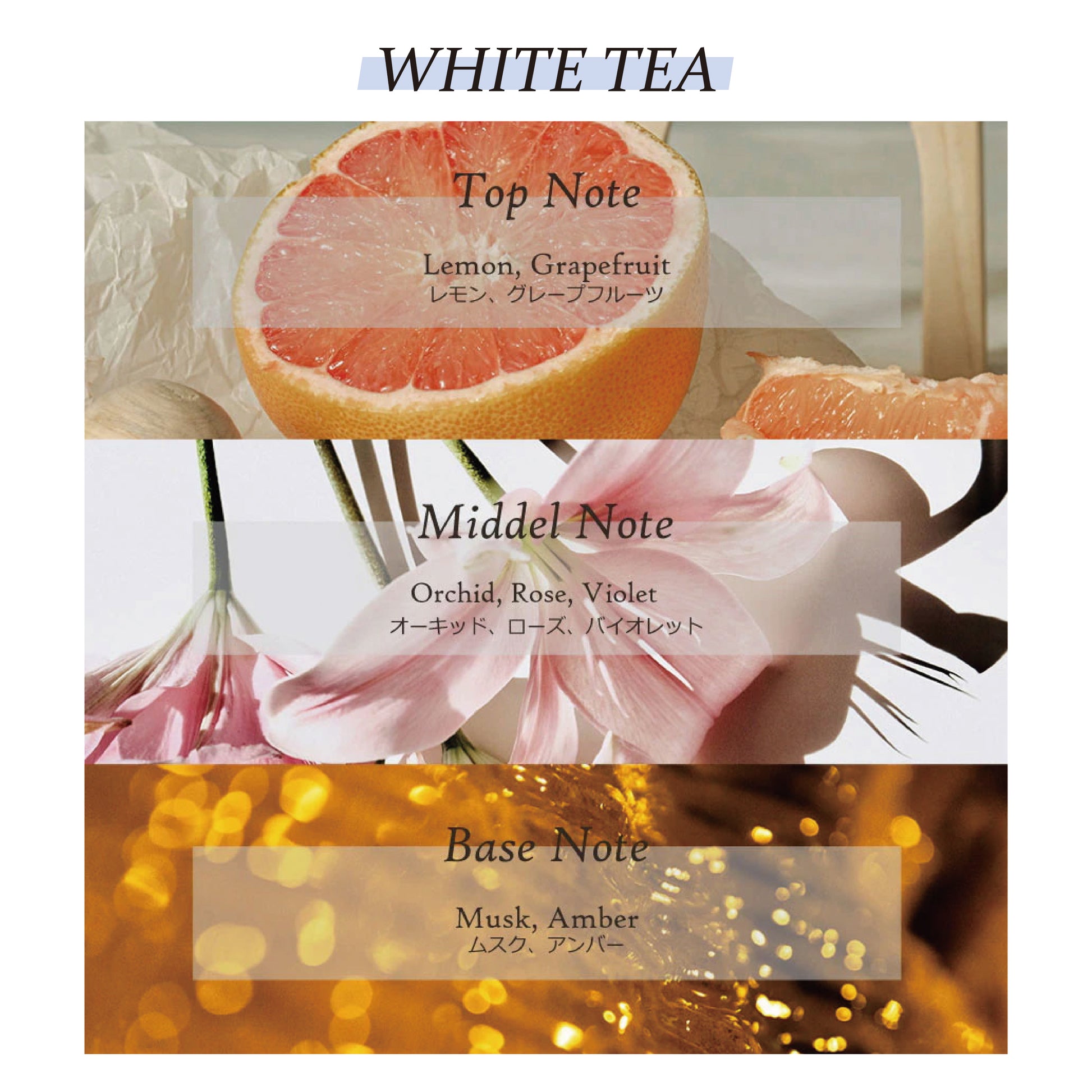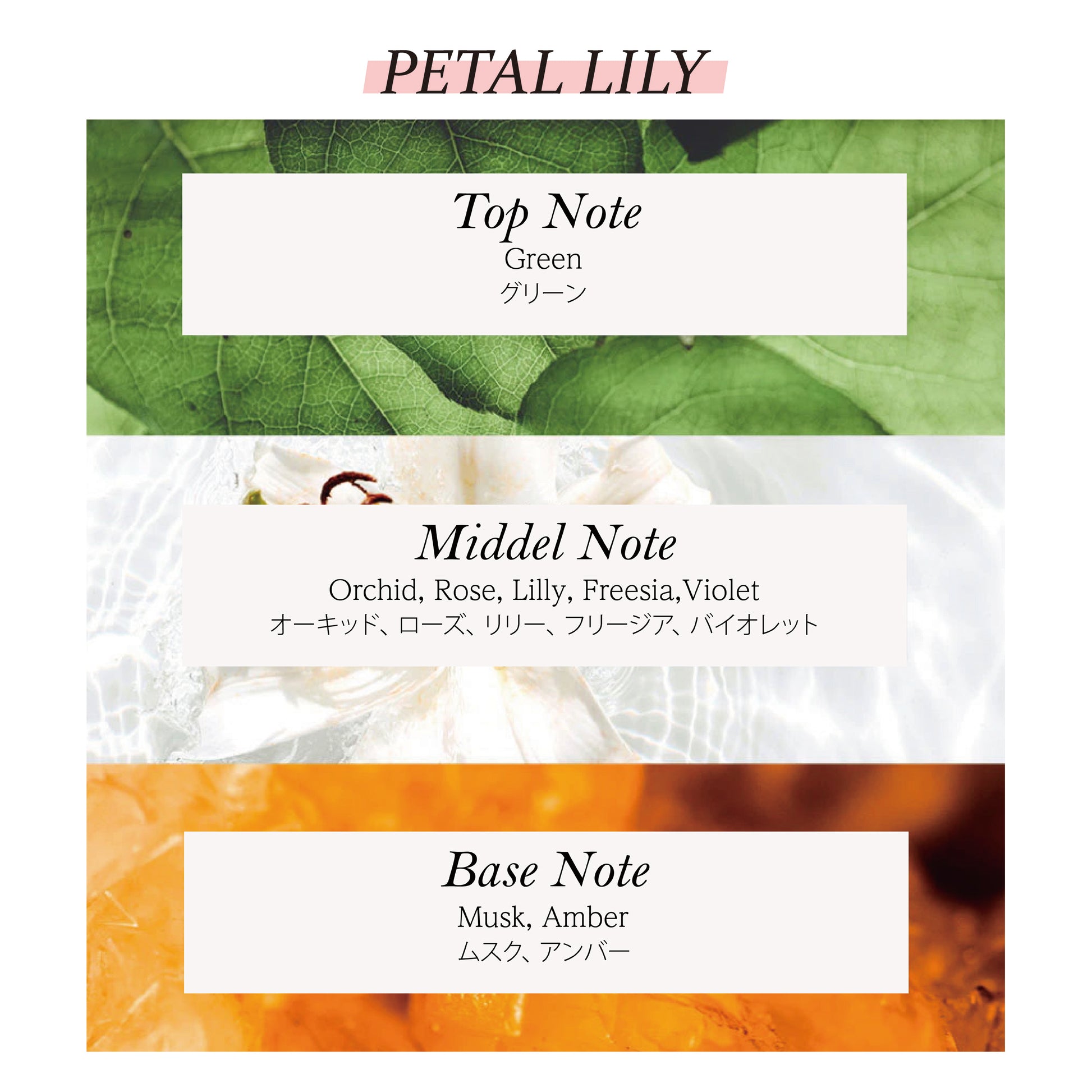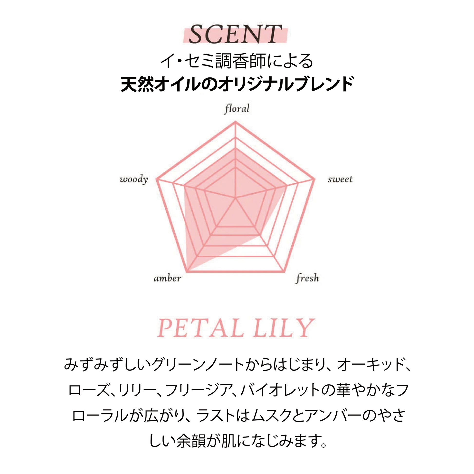 みずみずしいグリーンノートからはじまり、オーキッド、ローズ、リリー、フリージア、バイオレットの華やかなフローラルが広がり、ラストはムスクとアンバーのやさしい余韻が肌になじみます。