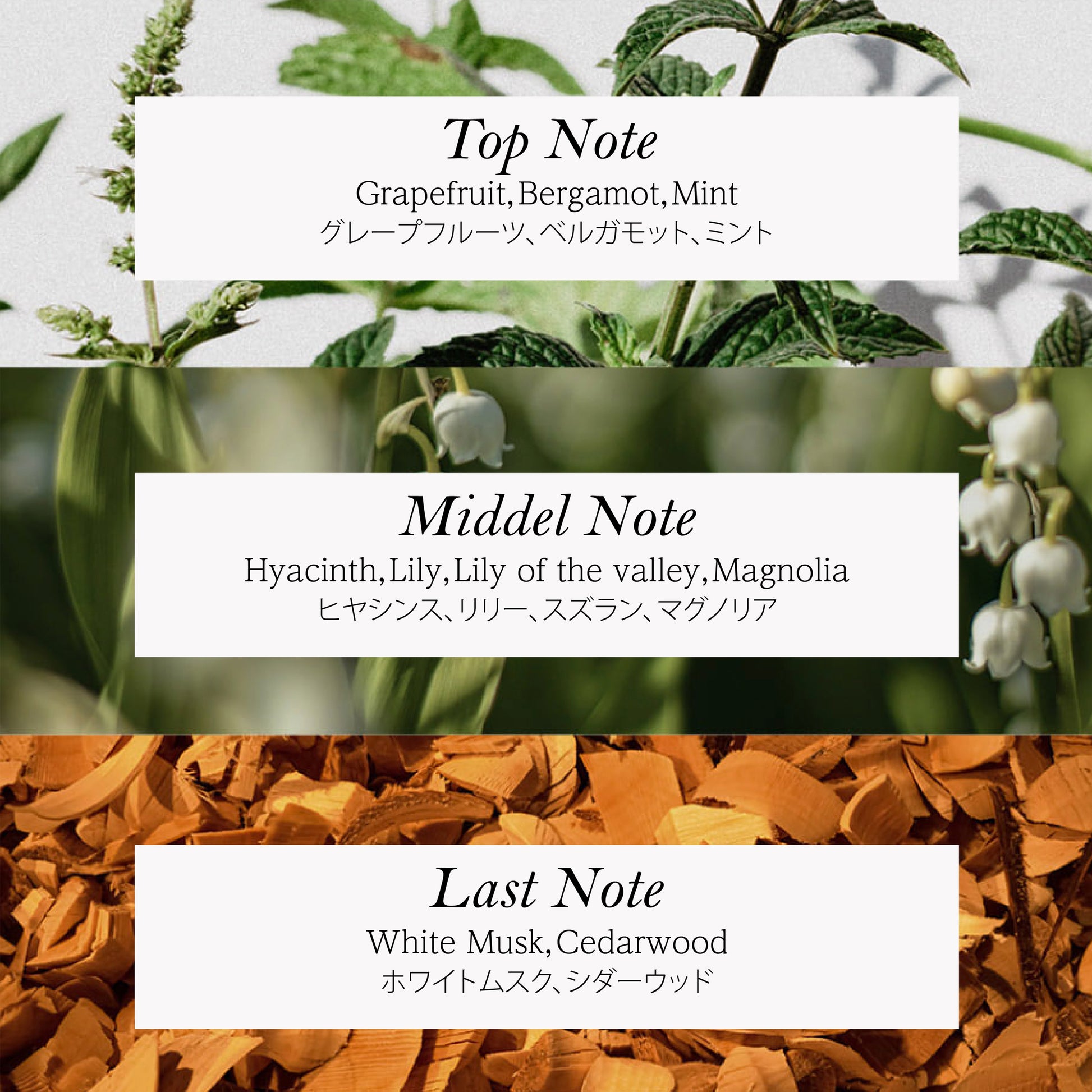 シトラスとミントのフレッシュなトップノートに、ホワイトフローラルのブーケがふんわりと重なり、ホワイトムスクとシダーウッドが深くやさしい余韻を添えます。